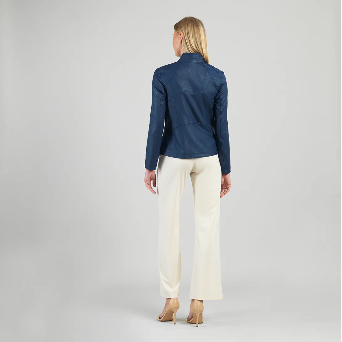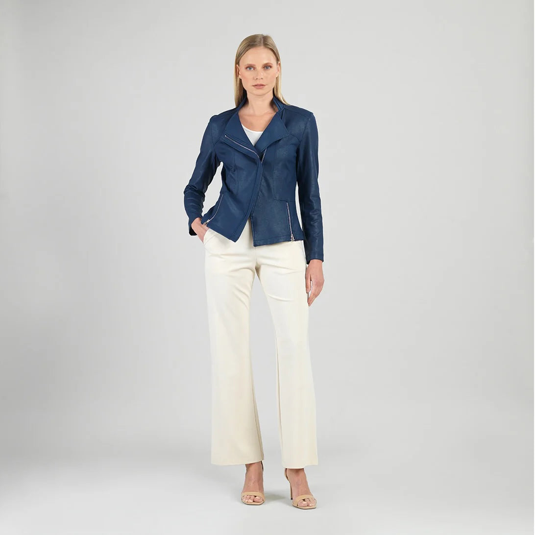 Let our faux Liquid Leather Signature Jacket pour all over you as it is made from our beautiful signature stretch knit, extremely lightweight soft "lambskin feel" fabric with a soft matte finish. This jacket features a notched lapel with an upright collar, long sleeves, a rustic gold a-symmetrical zip closure, faux pocket zipper slits as well as complimentary detailed front and backstitching.